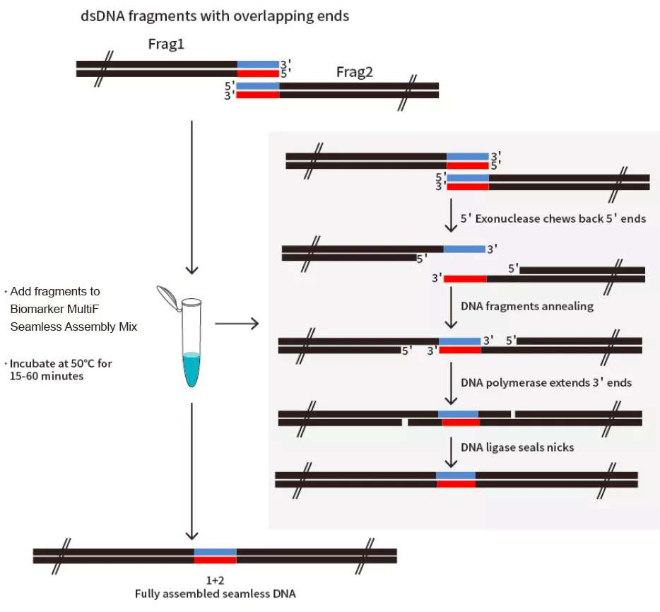 圖1:Biomarker MultiF Seamless Assembly Mix試劑盒,無(wú)縫克隆實(shí)驗(yàn)原理。