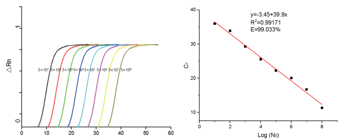 圖1:將質(zhì)粒進行8 個10倍梯度稀釋,以5×107 -100?拷貝/μl的質(zhì)粒為模板,進行擴增。發(fā)現(xiàn)Biomarker 2× SYBR Green Fast qPCR Mix擴增效率高,且可獲得良好的線性關系。