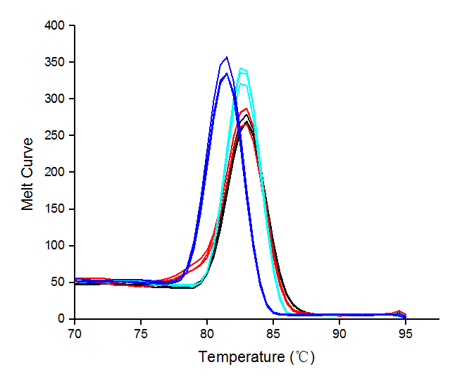 圖2:以1 μg不同物種的RNA為模板(藍色:人肝癌細胞;青色:雞;紅色:斑馬魚;黑色:水稻種子),用BiomarkerScript Ⅱ 1st Strand cDNA Synthesis Kit進行逆轉(zhuǎn)錄,得到cDNA產(chǎn)物。再以100 ng不同物種的 cDNA為模板,用反復凍融10次以上的Biomarker 2× SYBR Green Fast qPCR Mix進行qPCR擴增。結(jié)果所示:溶解曲線呈現(xiàn)特征單峰。