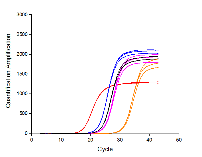 圖3:以1 μg不同物種的RNA為模板(紅色:人肝癌細胞;藍色:雞;黑色:斑馬魚;紫色:水稻種子;黃色:番茄果),用BiomarkerScript Ⅱ 1st Strand ?cDNA Synthesis Kit進行逆轉(zhuǎn)錄,得到cDNA產(chǎn)物。再以100 ng不同物種的 cDNA為模板,用Biomarker 2×SYBR Green Fast qPCR Mix進行qPCR擴增。結(jié)果所示:試劑盒可完美識別目標基因擴增,特異性極高。