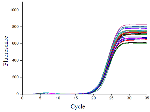 2.重復(fù)性檢測(cè):分別設(shè)置30個(gè)復(fù)孔,擴(kuò)增相同的基因,發(fā)現(xiàn)擴(kuò)增曲線的Ct值幾乎一致。