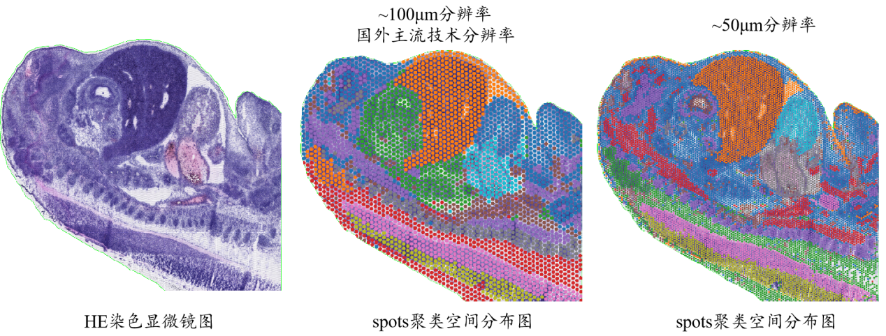 百創(chuàng)S1000分辨率最高可達到4.8μm,相比目前主流空間轉(zhuǎn)錄組測序芯片精度提高了近400倍,高分辨率下HE染色組織形態(tài)學(xué)與spots聚類空間分布圖重合度更高,可以更加精準(zhǔn)識別空間基因表達的異質(zhì)性和組織區(qū)域的特異性。